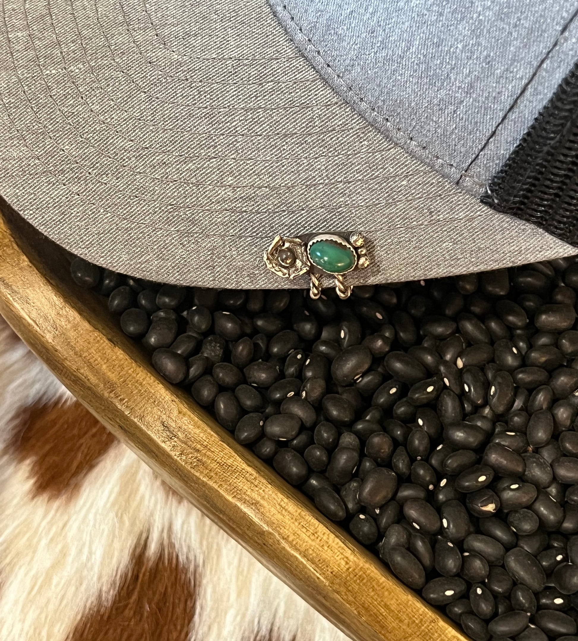 Caps need bling too! This turquoise and sliver cap clip with a silver flower accent will spice up your favorite cap or maybe even the brim of your cowboy hat!
