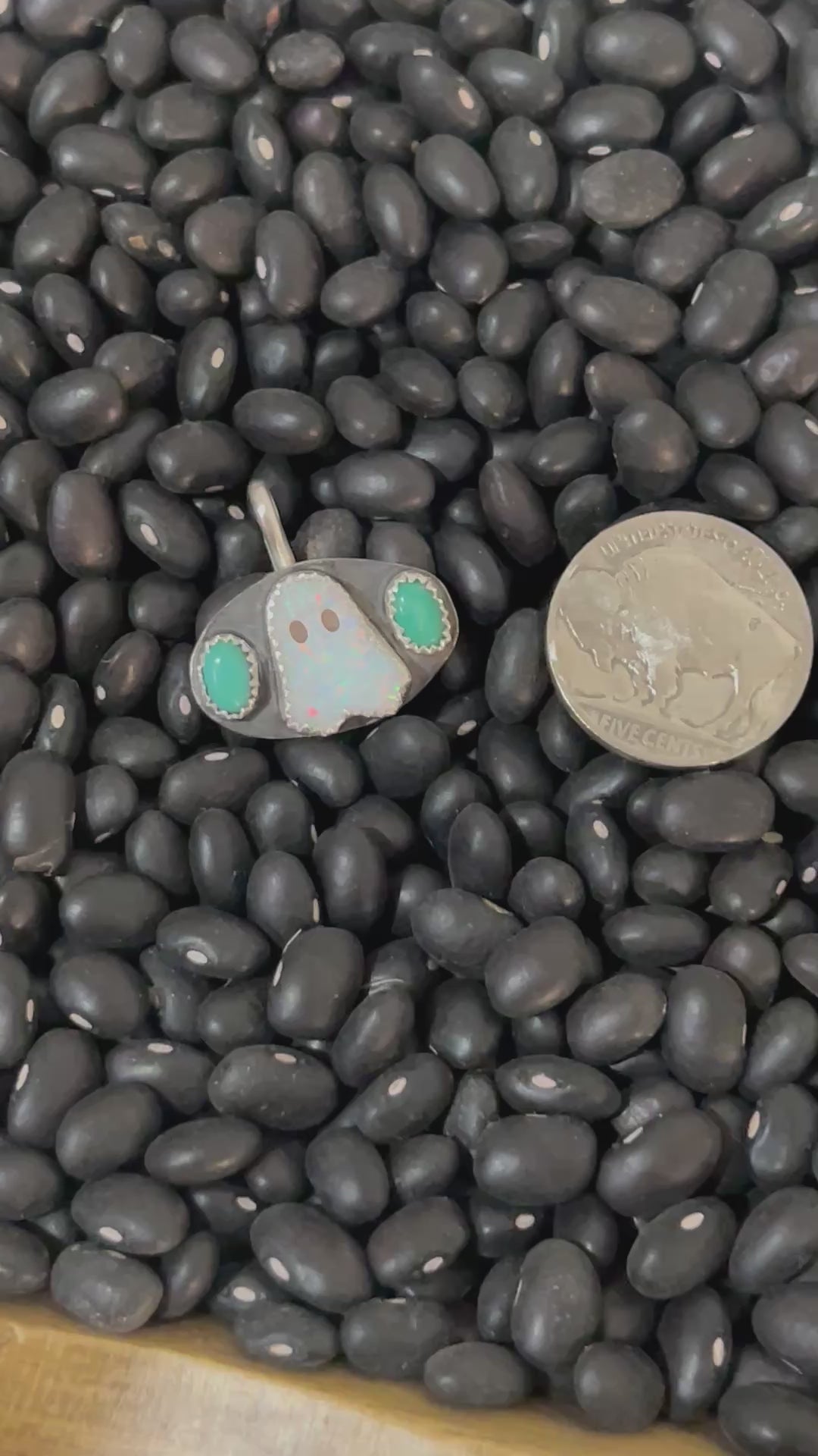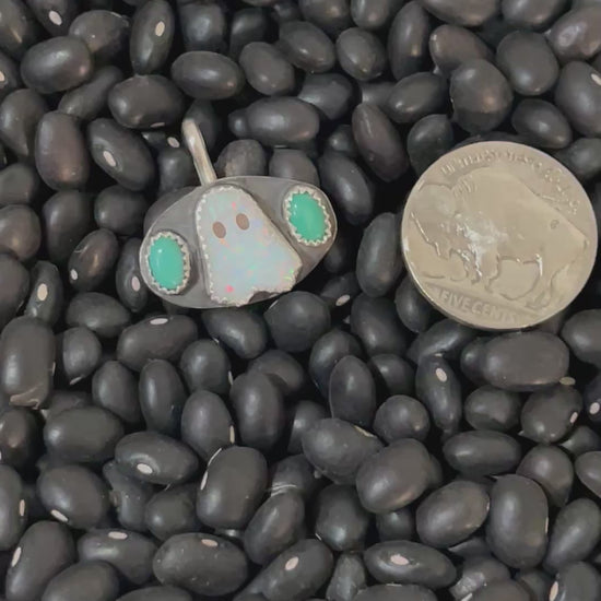 Opal ghost with turquoise pendant ready for spooky season. Handmade and set in .925 Sterling silver. Add a little bit of sparkle to your spooky season.