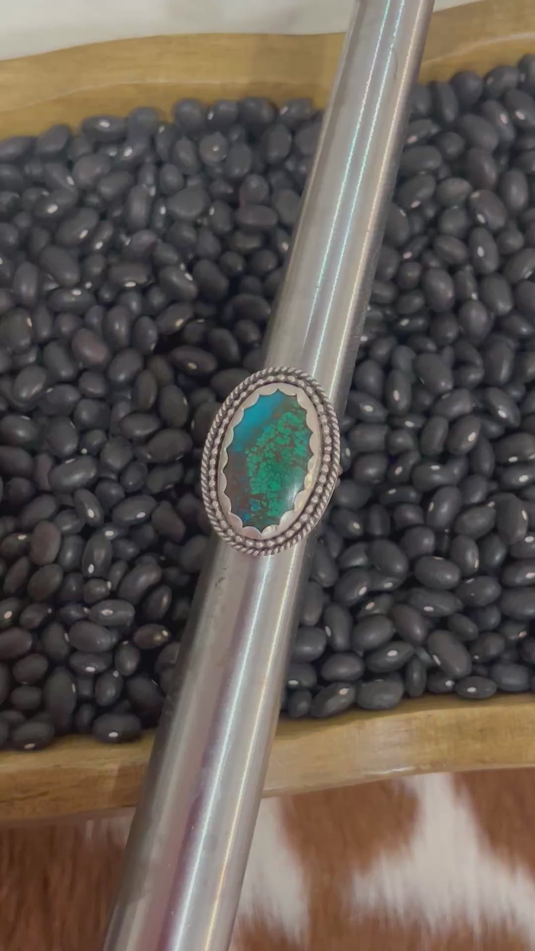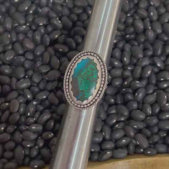 This stunning Peruvian Chrysocolla stone is set in a .925 Sterling Silver setting with twisted rope and bead border. It is perfect for casual everyday wear or out on a special occasion! Size 8