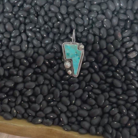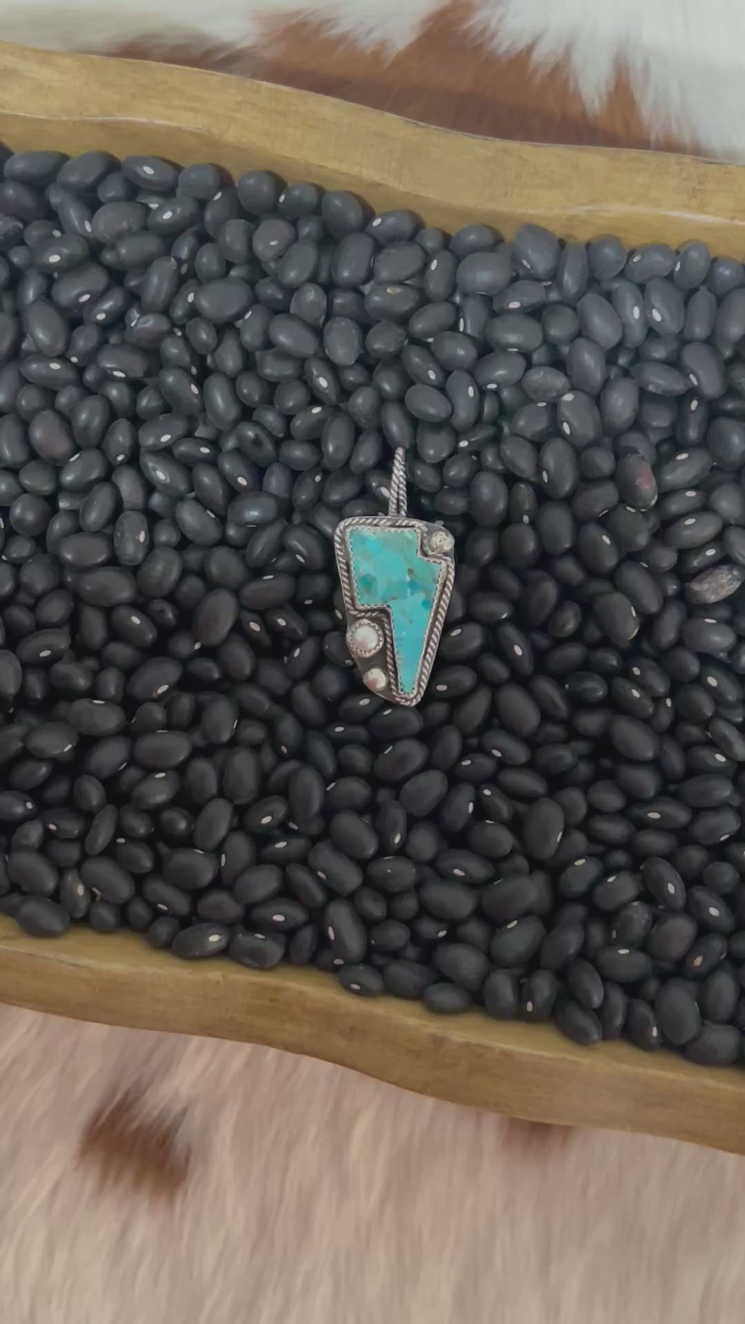 Kingman Turquoise lightning bolt pendant with Freshwater Pearl and sterling ball accents is handmade with .925 sterling silver. It’s the perfect piece to spice up any outfit.
